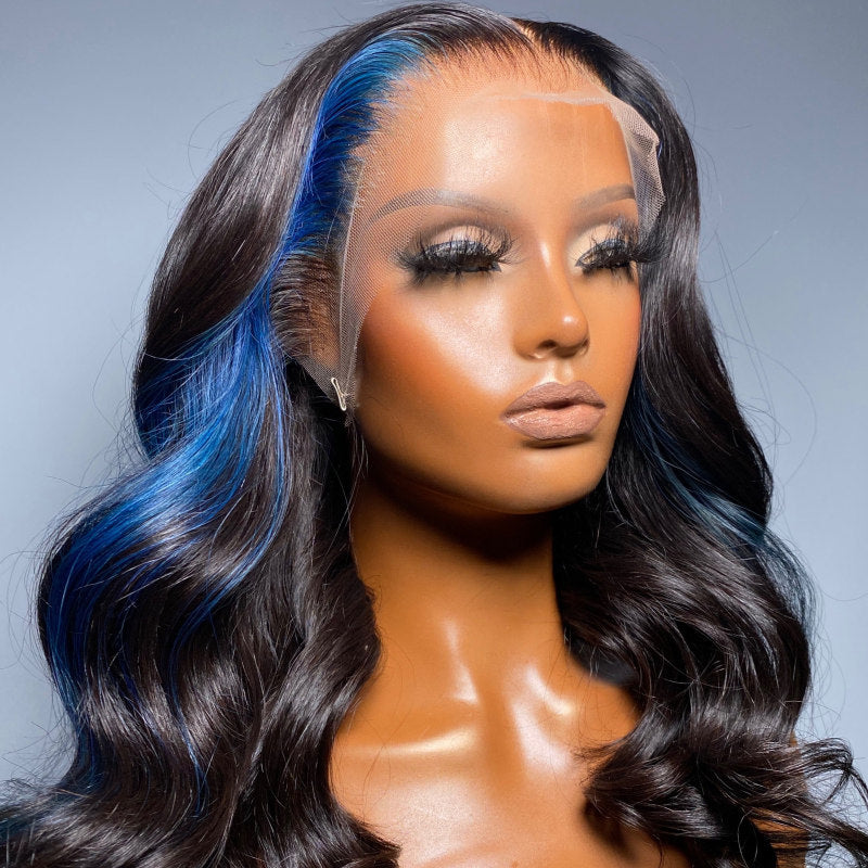 Beeos 13X4 SKINLIKE Real HD Full Frontal Lace Wig Black With Blue Skunk Stripe Body Wave BL161