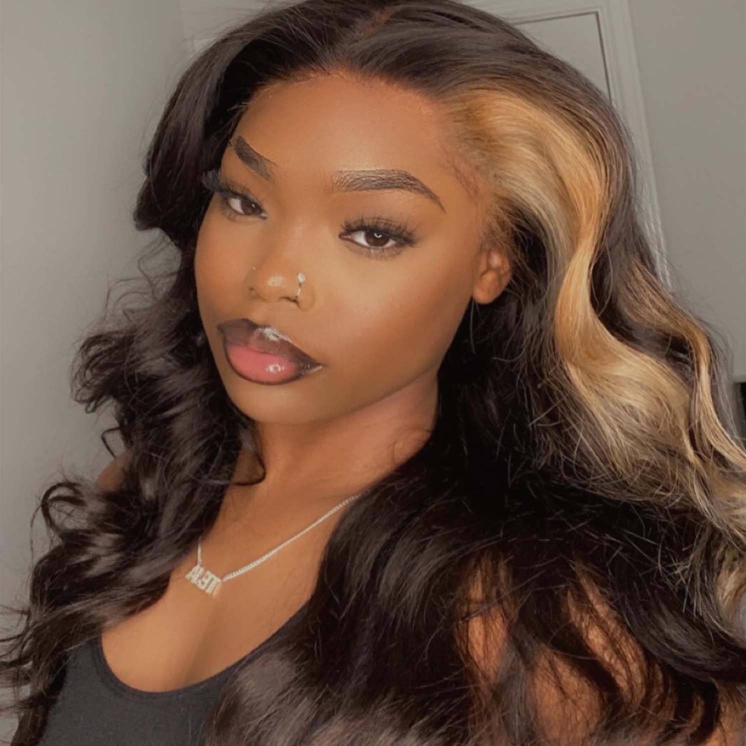 Beeos 13X6 SKINLIKE Real HD Lace Full Frontal Wig 250% Density Black With Blonde Skunk Stripe Hair BL133