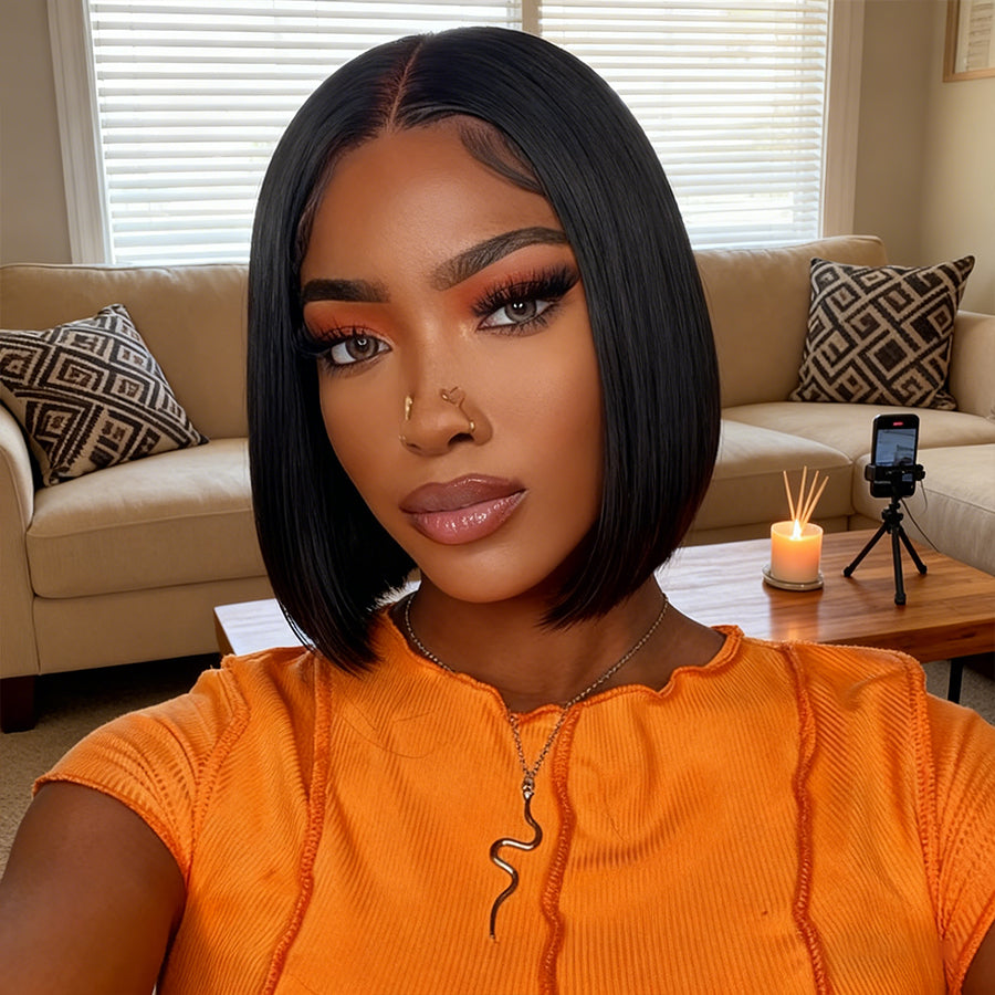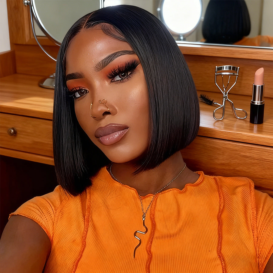 BEEOS 13x4 Full Frontal SKINLIKE Real HD Lace Bob Wig Short Straight Natural Black Color AM09