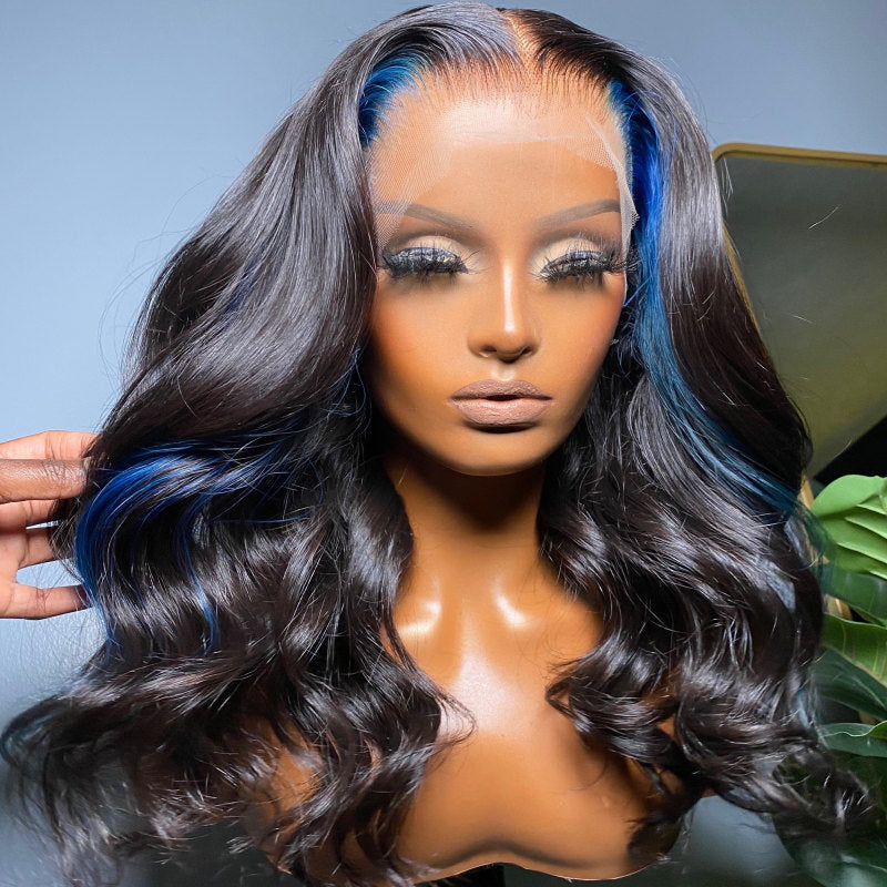 Beeos 13X4 SKINLIKE Real HD Full Frontal Lace Wig Black With Blue Skunk Stripe Body Wave BL161