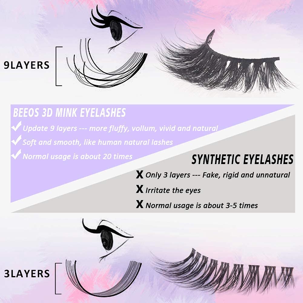 - 【Fluffy Volume with 3D Layered Effect - Suitable for All Occasions】BEEOS 3d mink lashes E11 feature fluffy volume and natural look. Its handmade 3D effect adds bold volume and depth to your lash look while the crisscrossing style creates a glamorous silhouette that begs to be touched! Perfect for professional application like girls night, festival, party and daily wear.